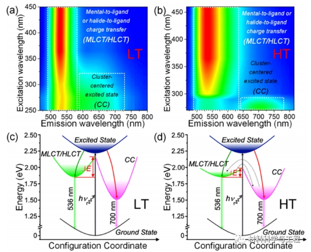 图 4. CNCI (a) 在低温(LT, 15 K)和(b)在高温(HT, 298 K)的连续PL/PLE相关图。(c) LT和(d) HT处的发射机制示意图。