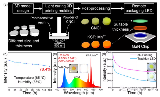 图 5. (a) WLEDs器件封装的3D打印流程图和详细制造工艺,该器件包含GaN蓝光LED芯片、发红光的KSF:Mn4+和发绿光的CNCI晶片。(b) CNCI晶体在168小时老化时间内的随时间变化的PL强度。(c)由20 mA电流驱动的制造WLEDs器件的PL发射光谱。(d) 使用3D打印制造的LEDs器件的蓝光稳定性与使用传统方法制造的LEDs的蓝光稳定性的比较。