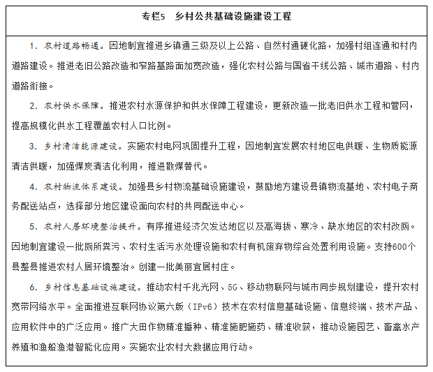 加强乡村信息基础设施建设。实施数字乡村建设工程。加快农村光纤宽带、移动互联网、数字电视网和下一代互联网发展,支持农村及偏远地区信息通信基础设施建设。加快推动遥感卫星数据在农业农村领域中的应用。推动农业生产加工和农村地区水利、公路、电力、物流、环保等基础设施数字化、智能化升级。开发适应“三农”特点的信息终端、技术产品、移动互联网应用软件,构建面向农业农村的综合信息服务体系。