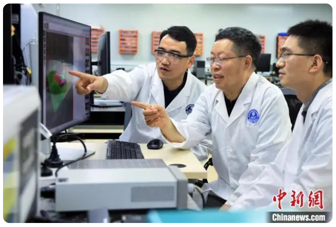 中科院大连化物所李灿院士(中)、范峰滔研究员(左)和陈若天副研究员在仪器前讨论信号分析问题。 中科院大连化物所 供图