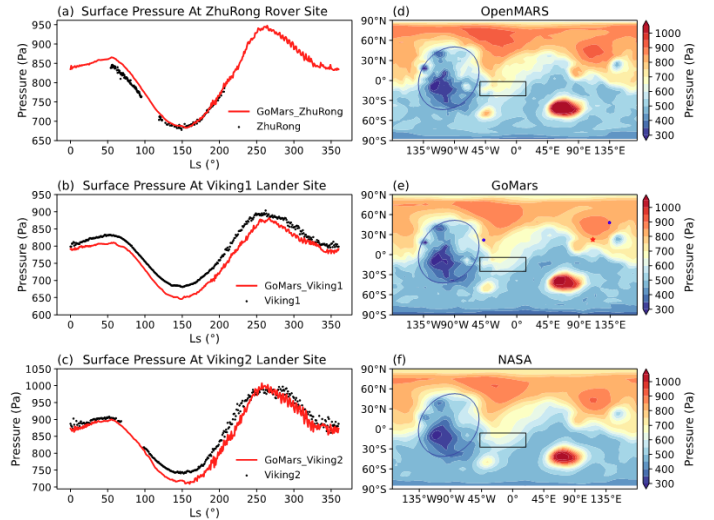 不同于地球,火星大气低压低温,水汽极少,沙尘变幻莫测。科研团队使用该模式模拟了火星大气环境中沙尘、水和二氧化碳三个关键气象元素的循环,并根据“天问一号”火星车“祝融号”和美国“维京1号”“维京2号”火星探测器的观测结果,以及国际火星大气全球数据集,对模式进行了性能验证。