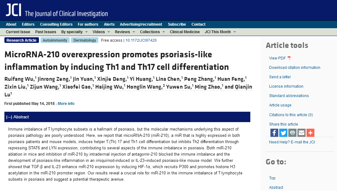 《Journal of Clinical Investigation》杂志创刊于1924年,是基础与临床医学研究领域的顶级杂志之一。此次陆前进教授团队发表的论文《MicroRNA-210 overexpression promotes psoriasislike inflammation by inducing Th1 and Th17 cell differentiation》,武瑞芳博士生及曾金容博士生为并列第一作者,陆前进教授、赵明教授、苏玉文教授为共同通讯作者。