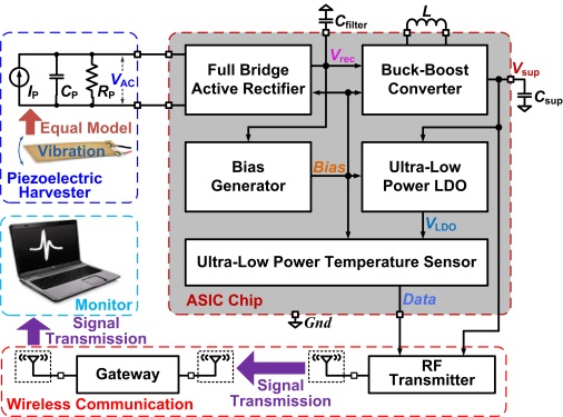 近日,西安交通大学微电子学院耿莉教授课题组的范世全副教授设计了一种针对压电能的单片全集成能量收集电源管理芯片。该芯片采用标准0.5 μm CMOS工艺制造,具有超低静态功耗(静态电流最低可达65 nA),可实现对压电能量的转换、收集及调整,输出超低噪声的电压供给片上的温度传感器。通过分析压电片的能量输出特性,提出一种与之匹配的单迟滞比较器环路结构,实现了在有限能量消耗的条件下收集尽可能多的能量。收集的能量通过存储在一个超级电容器中,可进一步用于射频发射机的供电,构成完整的无需电池的无线传感节点。芯片实测结果表明,该能量收集系统中的有源整流器电压转换效率高达97.1%;此外,阻抗匹配变换器可实现最小16 kΩ的输入阻抗,可匹配几乎所有常用的厘米级以下的压电片,甚至包括微米级尺寸的MEMS压电片;最后,片上集成的低压差线性稳压器(LDO)只需消耗750 pA的静态偏置电流即可提供10 nA至100 μA驱动能力的超低噪声电源供给后续负载。该芯片表现出的极低功耗、多功能及小型化等诸多优势,使其具有广泛的实际应用价值。
