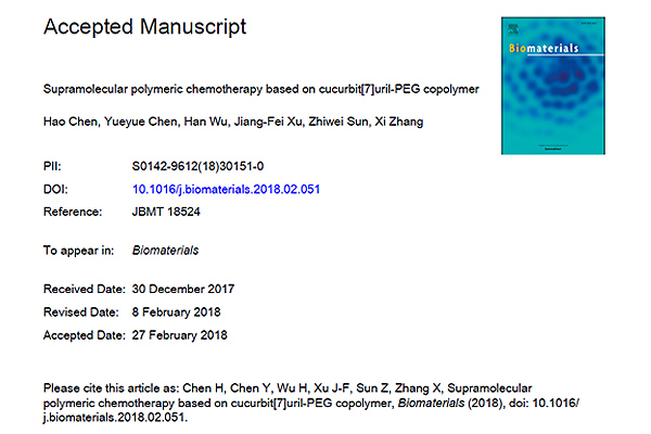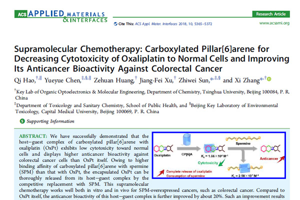 2018年2月,我校公共卫生学院孙志伟教授团队与清华大学化学系张希教授团队合作在国际期刊ACS Applied Materials & Interfaces(IF:7.823)发表文章,论文题目为"Supramolecular Chemotherapy: Carboxylated Pillar[6]arene for Decreasing Cytotoxicity of Oxaliplatin to Normal Cells and Improving Its Anticancer Bioactivity Against Colorectal Cancer",文章阐述了羧基化柱[6]芳烃作为一种新型纳米超分子载体的最新研究成果。我校陈月月讲师和清华大学博士生郝奇为共同第一作者。同年3月,两团队再次合作在国际期刊Biomaterials(IF:8.402)发表文章,论文题目为"Supramolecular Polymeric Chemotherapy Based on Cucurbit[7]uril-PEG Copolymer"。文章阐述了葫芦[7]脲与聚乙二醇偶联作为一种新型纳米超分子聚合物载体的最新研究成果。我校陈月月讲师和清华大学博士后陈浩为共同第一作者。孙志伟教授和清华大学张希教授为两篇文章的共同通讯作者。