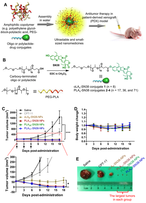 在本项研究中,郑树森团队基于前期发展的前药设计理念(Angew. Chem. Int. Ed., 2014, 53, 11532; Adv. Funct. Mater., 2015, 25, 4956; Cancer Res., 2017, 77, 6963),设计了第二代喜树碱衍生物SN38的前药。研究人员首先使用分子量不同的寡聚或高聚(oligo或poly)乳酸片段将SN38药物分子进行化学衍生,得到一系列SN38聚乳酸缀合物,发现所得前药能够与聚乙二醇-聚乳酸组装形成可系统注射的超稳定纳米胶束。相比短链聚乳酸修饰的SN38前药,长链聚乳酸修饰的药物在纳米胶束里面具有更好的缓释效果。此外,随着修饰的聚乳酸链长的增加,SN38药物的体内循环时间能有效延长。负载SN38的长循环纳米制剂在肝癌Hep 3B移植瘤模型中表现出优异的抗癌活性,经3次静脉注射给药后显示超过半数的肿瘤被消除。该药物在肝癌PDX小鼠模型中同样表现优异,7只裸鼠模型中,其中有5只的肿瘤被完全根除。更有趣的是,全身递送的纳米药物显著缓解了原药导致的血性腹泻。本项研究所使用的纳米药物载体为FDA批准的生物相容性较高的材料,具有较好的临床转化前景。