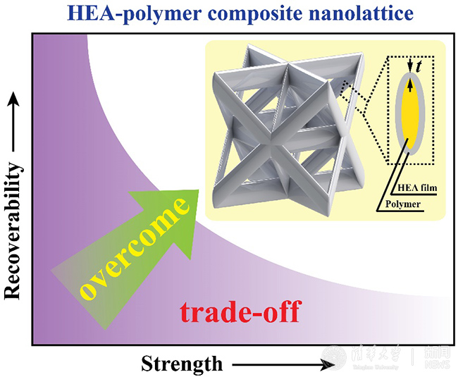 清华新闻网7月11日电  清华大学航天航空学院李晓雁课题组、与中国科学院金属所、美国布朗大学以及大连理工大学合作,在《纳米快报》(Nano Letters)发表了题为《克服强度-可恢复性制约的三维高熵合金—聚合物复合纳米点阵超材料》(Three-Dimensional High-Entropy Alloy–Polymer Composite Nanolattices That Overcome the Strength–Recoverability Trade-off)的研究论文。该论文设计并制备了一种由高熵合金和聚合物组成的复合纳米点阵超材料。该点阵材料兼具高强度和良好的可恢复性,克服了早先所有微纳米点阵材料的强度与可恢复性之间相互制约的问题。