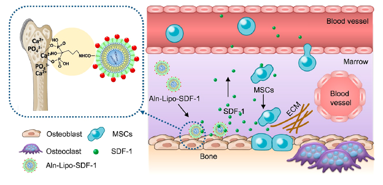 骨质疏松是老龄化社会中日益严重的退行性疾病,干细胞治疗技术对组织再生有着很好临床应用前景,提高骨折易发生部位骨髓干细胞的数量和成骨分化能力,将是一种有效防治老年骨质疏松及其导致骨折的治疗方法。然而,干细胞无法主动贴附于骨表面而受其微环境(nich)的影响进行成骨分化。因此,如何实现调控干细胞定向迁移到骨表面而发挥功效是干细胞治疗的一个难点。