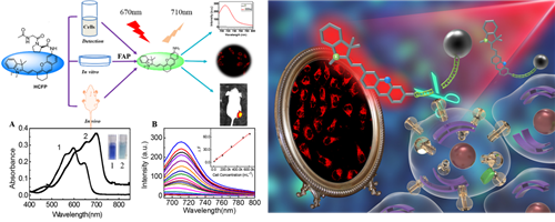 ①人成纤维细胞激活蛋白(Fibroblast activation protein,FAP)是一个分子量Mr=95KD的细胞表面抗原,主要选择性表达在上皮类型癌症的反应性基质成纤维细胞中。成人正常组织细胞一般不表达FAP。据报道,FAP可促进肿瘤生长和侵袭,由于其在肿瘤基质中近乎独有的表达,它可以作为一种肿瘤组织成像和治疗的潜在靶标。吴爱国团队基于成纤维细胞特异性识别并水解甘氨酸-脯氨酸(GP)二肽的性质,设计合成了一种靶向成纤维细胞激活蛋白的近红外荧光探针。该探针具有良好的特异性、灵敏性。其功能体现在能够体外检测表达FAP的癌细胞,体内进行肿瘤组织特异性荧光成像。该工作被选作封面发表在Journal of Materials Chemistry B, 2018,6,1449-1451。