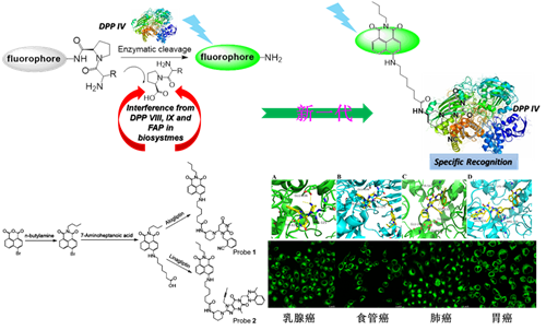 ②二肽基肽酶IV(Dipeptidyl peptidase IV, DPP IV)是一种多功能丝氨酸蛋白酶,在控制内分泌和免疫功能、细胞代谢、生长和粘附等方面具有关键作用。除了作为治疗2型糖尿病的著名治疗靶点之外,DPP IV还可作为一种新的分子标记物和潜在的癌症治疗靶标。此前,几乎所有DPP IV探针都是基于其水解功能设计的探针,但二肽基肽酶家族成员众多,利用水解方式设计探针势必存在同工酶的干扰。因此研究团队针对该问题提出一种新的非酶水解方式的DPP IV设计思路,采用DPP IV的抑制剂作为识别基团,提高探针的抗干扰性。结果表明,利用该思路合成的探针可极大地抗DPP IV其他家族成员的干扰。此外,该探针利用其识别部分与细胞表面的DPP IV蛋白亲和性,可有效靶向表达DPP IV的癌细胞成像。相关结果已被学术期刊Chemical Communications (DOI: 10.1039/C8CC05048A)接收。