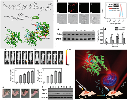 1)炎症反应是指生物体对内外损伤因子做出的保护性响应,在许多疾病中,炎症反应过程发挥着重要作用。炎症反应涉及到免疫细胞、血管以及分子的介导,目前有大量的关于炎症相关分子的研究报道。对炎症相关分子的研究有助于揭示炎症反应的机理,监控炎症反应的发生程度,从而对炎症相关的疾病进行正确诊断和和针对性的治疗。该团队设计出一种新的焦谷氨酸肽酶(PGP-1)近红外荧光探针,其结构基于一般探针设计策略:一种近红外荧光染料作为荧光信号发生部分,一个可被PGP-1特异性识别水解的封端肽作为靶向部分,酰胺键作为二者的连接部分形成一个PGP-1特异性响应的近红外荧光探针。该探针可在小鼠关节炎、肝炎模型中对PGP-1多寡产生相应荧光信号响应性变化。重要的是利用该探针结合传统分子生物学手段,证明了焦谷氨酸肽酶可以作为一种新的炎性因子。因此,这种靶向PGP-1的探针可应用于炎症疾病的体内外可视化成像监测。相关结果发表在国际知名期刊Adv.Sci., 2018,5,1700664。