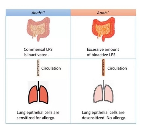 进一步研究发现,体循环中的微量LPS能够抑制过敏性哮喘,而Aoah-/-小鼠粪便、肠系膜淋巴结、血液、肺中活性LPS的量均显著升高。如用抗生素清除肠道中的革兰氏阴性菌,Aoah-/-小鼠恢复对HDM的应答,而经直肠给予LPS又抑制过敏性哮喘, 表明肠道菌来源的LPS如果不能被AOAH灭活,将通过体循环进入肺,诱导肺上皮细胞耐受,减弱对过敏原的应答从而抑制气道炎症。
