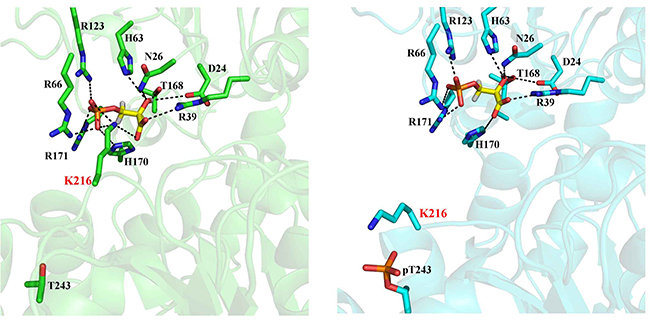 为了回答这一关键科学问题,李国辉团队与杨巍维团队密切合作,运用分子动力学模拟的方法,针对T243磷酸化前后PGK1与底物结合的分子机制进行研究,并发现T243的磷酸化影响了另一关键氨基酸(K216)的侧链朝向,进而对PGK1和底物结合的关键相互作用产生影响,导致磷酸化前后底物与PGK1亲和力发生明显变化。这一发现,从分子层面对实验结果进行了验证,并为胶质瘤治疗的新策略提供了详细的理论依据。