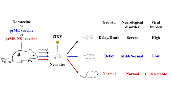 当前寨卡病毒疫苗的设计主要以包膜蛋白(envelope, E)为抗原靶标,前体膜蛋白(pre-membrane, prM)作为伴侣蛋白也常纳入疫苗设计。非结构蛋白1(non-structual protein 1,NS1)虽然在寨卡病毒复制、致病中起关键作用,但尚无研究以其作为抗原靶标。本研究中,研究人员以复制缺陷型2型腺病毒作为载体,探索了仅携带E,携带prM、E,携带prM、E以及NS1的三种疫苗策略。结果发现含NS1抗原组份的疫苗策略不仅在母鼠中有效抵御病毒血症,还能保护新生鼠免受寨卡病毒感染导致的体重减少、神经症状等,显著抑制病毒对新生鼠的感染。该研究表明prM、NS1的纳入可显著提升免疫保护效果,提示NS1可以做为寨卡病毒疫苗的抗原组份,值得进一步评估和开发。