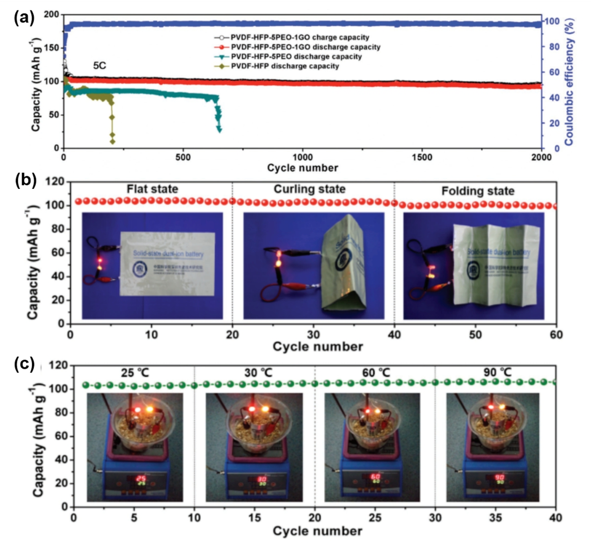 为了解决上述问题,唐永炳研究员及其团队成员陈光海、张帆等人最近研发出了一种PVDF-HFP、聚氧化乙烯(PEO)与氧化石墨烯(GO)共掺杂的凝胶电解质(简称PHPG)。该PHPG共聚物显示出3D多孔网络结构,并具有较高的离子电导率(2.1×10-3 S cm-1),从而有利于Li+和PF6-的传输。结果表明,基于该凝胶电解质的新型双离子电池具有优异的倍率性能和循环稳定性:该电池在4.0V的高平均放电电压下,在倍率为5C时充放电循环2000次后容量保持率高达92%。此外,该电池还具有良好的柔韧性和热稳定性,在高达90°C的环境下仍可以正常工作。该高效柔性双离子电池在可穿戴电子设备等领域具有广阔的应用前景。