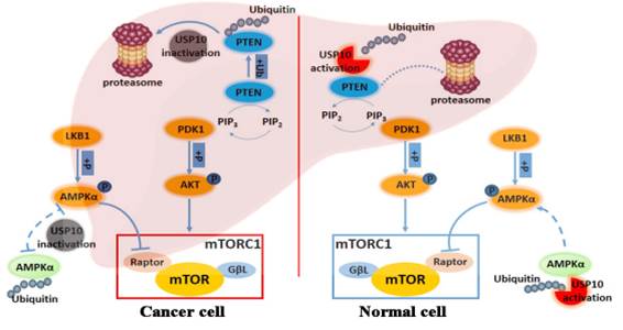 雷帕霉素靶蛋白(mTOR)是一个细胞生长、代谢的中央控制器,也是公认的抗癌药物的主要靶点,mTOR信号通路高度激活是肝癌发生的关键驱动因素之一。然而,mTOR上游基因PIK3CA和PTEN在肝癌中的突变率低,因此mTOR过度激活的机制仍不清楚。该研究团队在对泛素-蛋白酶体降解途径的研究中发现,mTOR在肝癌中的异常激活与去泛素化酶USP10在肝癌中的低表达密切相关,并且USP10的表达与肝癌预后呈显著负相关。而后通过一系列生物信息学、细胞分子生物学及肿瘤生物学研究发现,USP10通过去泛素化mTOR上游的两个关键调控蛋白分子AMPKα及PTEN来参与mTOR的激活抑制。该研究结果揭示了USP10是肝癌的一个重要抑癌基因,可作为一个以mTOR为治疗靶点的生物标记物,对以mTOR为靶向的肝癌治疗有着潜在的指导作用。