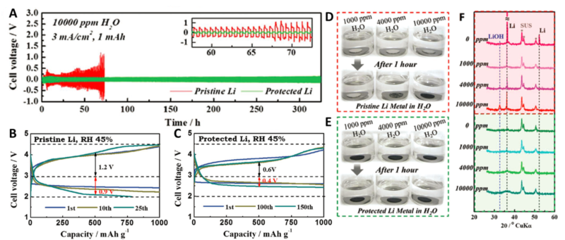 图2:锂在含H2O电解液中的防腐蚀性能。A-C)未处理的锂片(红色)和受保护的锂片(绿色)在锂对称电池中的恒流循环曲线,其中,电解液中H2O含量不同,电流密度为3 mA cm -2。 插图显示的是不同循环圈数的电压变化。D,E)未处理的锂片和受保护的锂片在刚接触和暴露于不同H2O含量的溶液中1 h的密封小瓶。F)未处理的锂片(红色)和受保护的锂片(绿色)分别暴露于0,1000,4000和10000 ppm H2O 1 h后的XRD图。