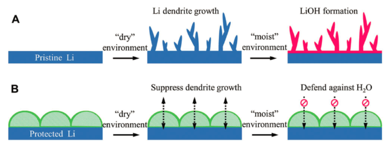 图1:A,B)不同环境下锂的沉积/剥离示意图: 无保护层(A)和有保护层(B)。