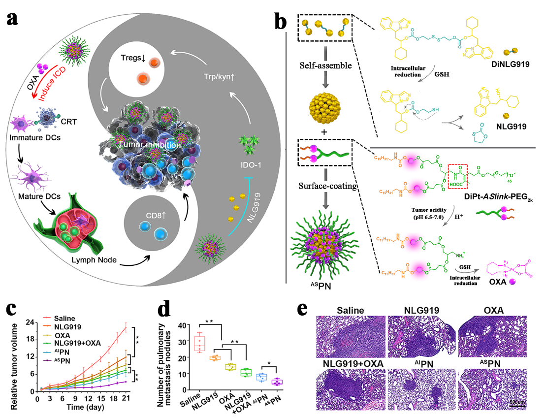 (a) 二元协同前药纳米粒介导高效免疫治疗机制示意图; (b) 前药纳米粒的化学构成及肿瘤微环境响应机理; (c) 前药纳米粒激活机体免疫应答抗结肠癌移植瘤药效评价; (d, e) 前药纳米粒抗乳腺癌肺转移药效评价