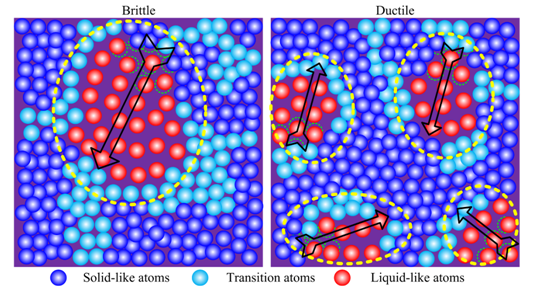 脆性和韧性金属玻璃的不同原子结构示意图
