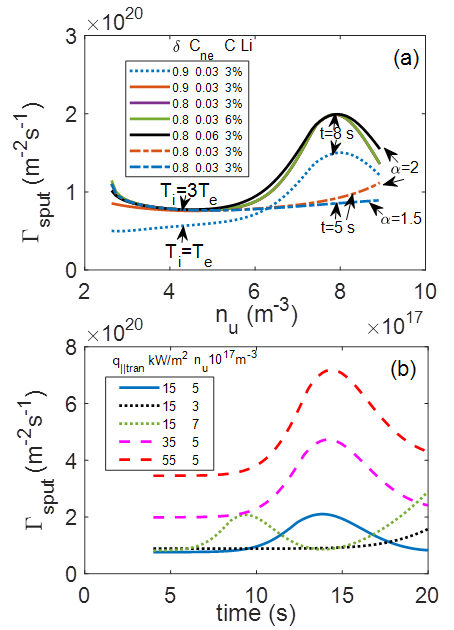 图3.(a)不同参数下碳杂质溅射通量密度与上游等离子体密度依赖关系;(b)不同平行方向能流和上游等离子体密度情况下碳杂质溅射通量密度时间演化图。
