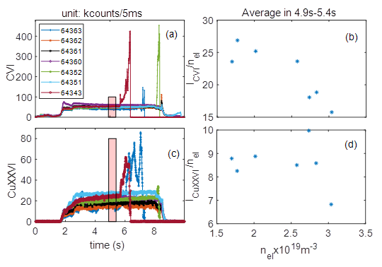 图2.(a)不同炮下C5+杂质演化图;(b)密度归一化C5+杂质浓度与等离子体密度依赖图;(c)不同炮下Cu25+杂质演化图;(d)密度归一化Cu25+杂质浓度与等离子体密度依赖图;