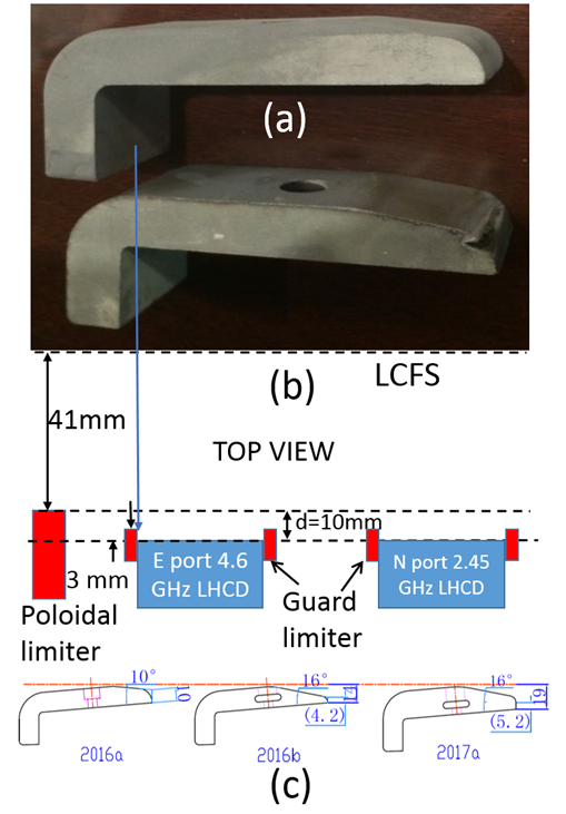 图1.(a)损坏的天线口石墨瓦与全新石墨瓦比较图;(b)低杂波天线和极向限制器位置示意图;(c)石墨瓦块形状在2016a,2016b和2017a实验演化图。