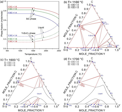 图3 Y-Si-C三元系相图:(a)Y:SiC成分比例为1:4、1:6和1:8时,系统相组成随温度的变化;(b)1100℃等温截面;(c)1600℃等温截面;(d)1700℃等温截面