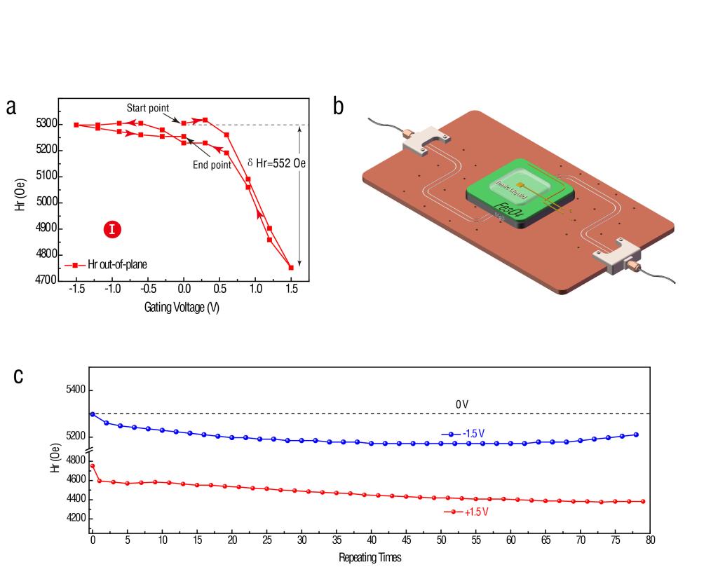 近日,西安交通大学电信学院“青年千人”刘明教授课题组研究了基于离子液体调控四氧化三铁/氧化镁(Fe3O4/MgO)的磁性异质结。通过对Au/[DEME]+[TFSI]−/ Fe3O4/MgO施加1.5 V的门电压,在单次加压实验中实现了对Fe3O4高达552 Oe的磁各项异性场调控,对应着高达368 Oe/V的磁电耦合系数。更为值得注意的是,在极低的门电压下离子液体本身未发生明显的电化学反应,从而使得该调控过程可以多次往复进行,通过对离子液体施加±1.5 V门电压,在循环次数得到70~80次时,磁各向异性调控可保持稳定在大约922 Oe的调控量。该研究结果对于商业化的磁电耦合器件的设计与研发具有重要的意义。