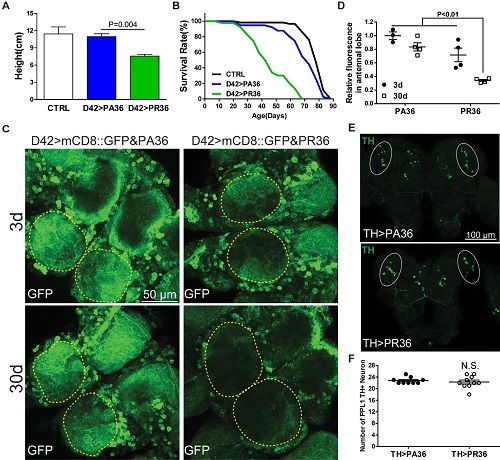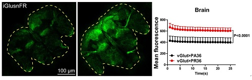 此项研究中,许望超和徐进用果蝇作为模式生物,通过运用强大的遗传学工具对C9orf72六碱基重复序列的主要产物—双肽重复序列蛋白的神经毒性机理进行了研究, 并意外地发现富含精氨酸的GR或PR双肽重复序列蛋白可以导致果蝇中谷氨酸能神经元的特异退化。这个选择性神经退化机制伴随胞外谷氨酸和胞内钙离子浓度的增加以及突触结构的增生。而抑制谷氨酸能神经元中谷氨酸的释放或阻碍其细胞膜上的NMDA受体可以有效地缓解GR/PR的神经毒性,从而提示这是一个新的谷氨酸能依赖的、细胞自主式的神经退化机制。