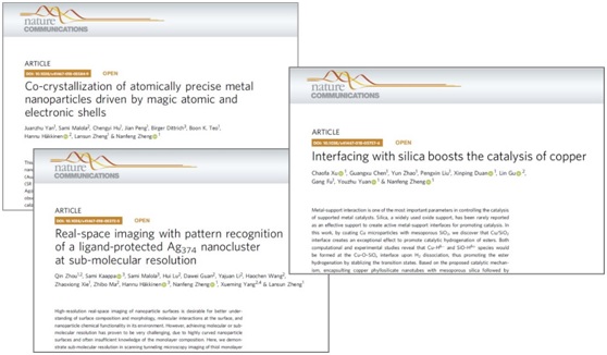 与厦门大学傅钢、袁友珠教授以及中国科学院物理研究所谷林研究员密切合作,历时五年,在多相催化的金属-载体界面效应研究方面取得重要进展。SiO2被广泛用作工业负载型金属催化剂的载体,多被视为惰性载体,在催化过程中仅起到分散金属的作用。郑南峰教授领衔的合作研究打破这个催化领域的“定式”。他们发现了“惰性”载体SiO2与Cu之间存在可以数量级提升酯基加氢催化性能的活性界面,揭示了相关界面效应的分子作用机制,并应用于指导实用铜催化剂的制备。相关成果 “Interfacing with silica boosts the catalysis of copper”发表于《自然 通讯》(Nature Communications, 2018, 9, 3367)。