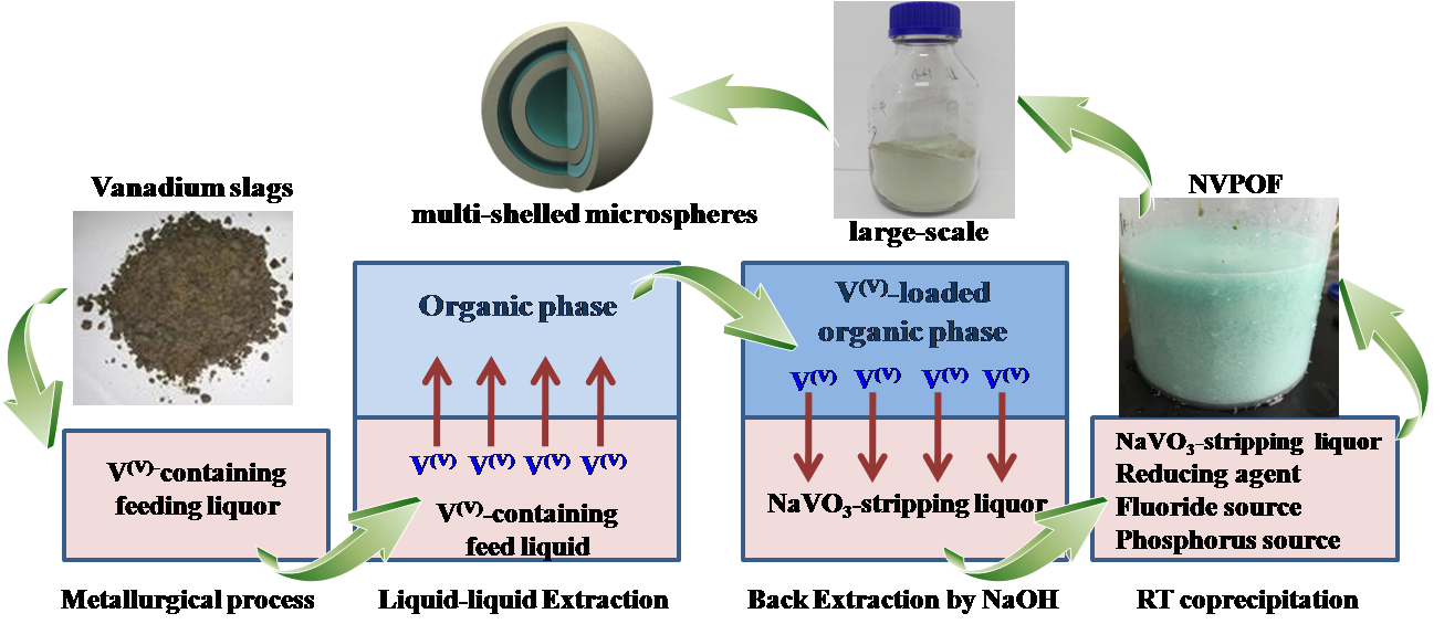 以赵君梅副研究员领导的小组长期以来一直攻关氟磷酸钒钠的低能耗绿色合成方法。最近,在针对NVPFs进行了一系列水热/溶剂热合成方法系统研究之后,她们进一步提出以萃取分离为前提直接制备功能材料,即萃取分离制备一体化的概念,并以Na3(VOPO4)2F(NVPOF)为例,开发了一步便利的室温可控制备技术,阐述了这一概念的具体应用。NVPFs自1999年由法国科学家J.-M. Le Meins首次报道以来,一直沿用的是高温固相的合成方法,而高能耗势必增加该材料的成本,这将限制该材料的广泛应用。据报道,法国著名科学家Jean-Marie Tarascon教授已经将氟磷酸钒钠用于做成圆柱形18650钠离子电池,然而仅限于实验室。而我们开发的基于萃取分离的室温一步可控制备技术大大地降低了正极材料的生产成本。特别有意思的是,通过巧妙设计,获得的NVPOF是一种具有多壳层微观结构的微球,其形成机理主要是基于原位生成的气泡作为软模板,并且溶液中共沉淀产生的纳米颗粒与气泡表面发生层层自组装的结果。所合成的NVPOF微球,在没有任何额外的高温烧结、纳米化以及碳包覆处理的条件下,展现了优越的倍率性能和突出的循环性能。可以说有关氟磷酸钒钠的实验室研究目前已达到国际领先水平。