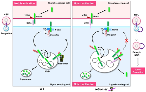 单方向(unidirectional)Notch信号的正确建立和维持对于多种干细胞谱系中的细胞命运决定和稳态调控都至关重要。譬如,神经干细胞不对称分裂时会将Notch负调控因子Numb不对称分配至未来神经祖细胞中,进而通过由Numb介导的Notch受体内吞来下调Notch信号,建立从神经祖细胞至干细胞的单方向Notch信号。然而,干细胞谱系内防止Notch信号细胞自主性(cell-autonomous)异位激活的分子调控机制还尚不清楚。利用果蝇神经干细胞谱系作为理想模型,宋艳研究组发现,虽然Numb的不对称分配促使神经祖细胞质膜上Notch受体的不对称内吞,却同时增加了Notch受体在祖细胞胞内被异位激活的风险。通过遗传筛选,他们发现,逆转运复合体Retromer是化解这一危机的关键。Retromer复合体是一个进化上高度保守的内体分选(endocytic sorting)复合体,主要介导跨膜蛋白从内体(endosome)到反式高尔基体网络或质膜的逆向囊泡运输。之前的研究表明Retromer复合体在动物体发育过程中起着重要作用,而其功能障碍与包括阿尔茨海默症、帕金森综合症等神经退行性疾病在内的多种人类疾病的发生息息相关。