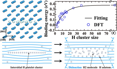 图. 氢在金属(钨)中自发偏聚产生的片层状团簇和自发偏聚结合能,以及氢自发偏聚诱发的氢泡形核过程示意图