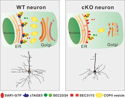 神经发育对神经元网络的形成和正常脑功能至关重要。中国科学院遗传与发育生物学研究所许执恒研究组先前的研究表明cTAGE5/MEA6在肝脏中参与调控极低密度脂蛋白从内质网到高尔基体的运输过程及分泌(Cell Research 2016),在胰腺中调控胰岛素原的运输及胰岛素的分泌 (J Cell Biology),但其在细胞非分泌成分的转运和脑发育中的作用尚不清楚。研究组成员发现在大脑中条件敲除cTAGE5/MEA6导致神经发育的严重缺陷,包括神经元树突和突触的生长、形成和维持缺陷、星形胶质细胞激活和动物异常行为。同时,揭示了cTAGE5 / MEA6的缺失影响COPII组分,SAR1和SEC23之间的相互作用,导致SAR1的持续激活,COPII囊泡形成及内质网到高尔基体的物质转运异常,因此扰乱了神经元中膜组分的运输。这些缺陷不仅影响树突和突触发育所需的物质运输,还影响神经元发育所需的信号传导途径。由于在患有Fahr病的患者中发现了cTAGE5/MEA6的突变,该研究还为这种疾病的发病机理提供了深入见解。