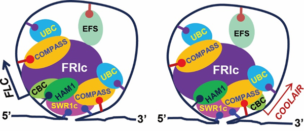 模式植物拟南芥存在两类生态型,一类为早花的速生生态型,一类为响应“春化作用”的越冬生态型;速生型由越冬型突变而来。早在1955年,就已发现在越冬生态型中,存在一个命名为FRIGIDA(frigid+a)的位点决定越冬习性形成。随后的遗传分析表明FRI位于开花抑制基因FLC的上游,通过促进FLC表达,从而抑制植物在过冬(春化)前开花;这一机制广泛存在于十字花科植物中。2000年FRI基因被图位克隆,编码一个植物特有的支架蛋白 (scaffold protein),并不直接与DNA序列结合。近二十年来,已发现至少有二十几个蛋白参与FRI对FLC位点的激活,多数为染色质修饰因子如组蛋白H3K36甲基转移酶EFS、组蛋白H3K4甲基转移酶复合体COMPASS、组蛋白H2B泛素化的UBC-HUB复合体等。然而这些蛋白及其它调控因子如何与FRI协同激活FLC表达,仍未知。