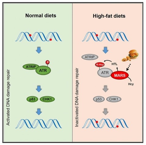 高脂饮食状态下,MARS被激活并促进ATR蛋白的同型半胱氨酸化修饰,进而抑制ATR活性及其下游DNA损伤修复通路,导致DNA损伤的积累。