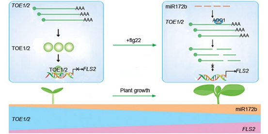 新生儿出生后其天然免疫系统经历了巨大的变化。那么在种子萌发后,植物其天然免疫系统是否也会随幼苗的发育而逐步成熟尚不清楚。中国科学院遗传与发育生物学研究所农业资源中心吕东平研究组与福建农林大学唐定中教授合作,发现由免疫受体FLS2介导的免疫反应在拟南芥幼苗的生长过程中不断增强,说明植物天然免疫系统经历了一个逐步建成(Ontogenic)的过程,而这个过程受FLS2基因转录的控制。进一步的研究发现,两个AP2类转录因子TOE1和TOE2可以直接与FLS2基因的启动子结合,并抑制FLS2基因的转录。已知TOE1和TOE2为小RNA miR172的靶基因。进一步的研究发现,在拟南芥幼苗的生长过程中,miR172的丰度逐步升高,TOE1和TOE2的蛋白积累逐渐降低,因而,TOE1和TOE2对FLS2转录的抑制逐步减小,这使得FLS2基因在幼苗的生长过程中的表达逐渐提高,最终促成了FLS2介导的天然免疫系统的建成(Ontogeny)。