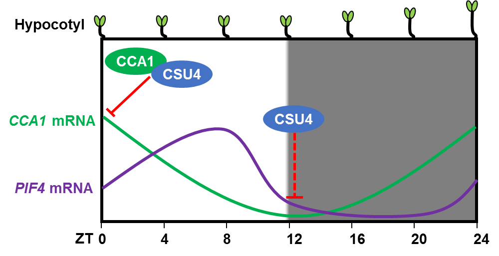 邓兴旺实验室结合遗传学和生物化学的方法,鉴定到了一个新的光形态建成的正调节因子CSU4。CSU4是COP1和DET1的遗传抑制子。进一步研究发现,CSU4参与了生物钟节率的调节,它可与生物钟节率核心因子CCA1直接互作并抑制其转录抑制功能。CSU4在清晨抑制CCA1基因的表达,在傍晚抑制PIF4基因的表达。同时,CSU4也调节了众多其他生物钟节率基因的表达。研究证明CSU4是一个整合生物钟节率和光信号途径的关键调控子,在不同的时间点调控植物的生长发育过程。