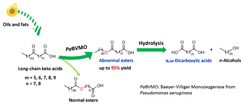 DCA是重要的可再生化工产品,广泛用于聚合物、增塑剂、润滑剂、表面活性剂和药物等产品制造。传统生产方法需要在高温高压下对蓖麻油酸氧化裂解,并消耗大量的强酸和强氧化剂,反应条件苛刻,环境影响和安全隐患较大。利用油脂等可再生资源,通过生物催化转化生产DCA,是解决化工绿色生产和环境问题的有效途径之一。其中,BVMO催化的单加氧反应,直接利用空气中的氧气作为氧化剂,在长链酮基脂肪酸中的羰基旁插入氧原子,再通过简单水解反应获得DCA是最关键的一步,也是最具挑战性的一个反应。虽然有文献报道过这类反应,但反应效果很不理想,主要原因在于目前已知的大部分BVMO具有“常规”区域选择性,即氧原子插在羧基取代一侧,水解后生成的是α,ω-羟基酸,而非α,ω-二元酸,还需要经过两步氧化反应才能得到DCA,遮掩不仅反应步骤多,而且需要耗费大量的氧化酶和辅酶。