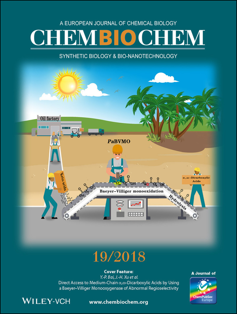 近日,我校生物工程学院许建和和白云鹏课题组率先报道了一种具有高度“非常规”位置选择性的Baeyer-Villiger单加氧酶(BVMO),在温和条件下将长链脂肪酮酸高选择性转化为中长链α,ω-二元酸(DCA),建立了基于可再生植物油脂两步酶法制备高附加值精细化学品的绿色过程。该工作为油脂生物转化合成二元酸化学品提供了一条全新的路线,未来通过蛋白质工程手段有望大幅度提高生物催化剂的活力和稳定性,进一步提高反应效率,对发展高效环保的生物基化学品绿色制造技术具有重要意义。研究成果以“Direct access to medium-chain α,ω-dicarboxylic acids using a Baeyer-Villiger monooxygenase of abnormal regioselectivity”为题,作为VIP(very important paper)封面文章在ChemBioChem发表,并被ChemistryViews作为亮点报道。