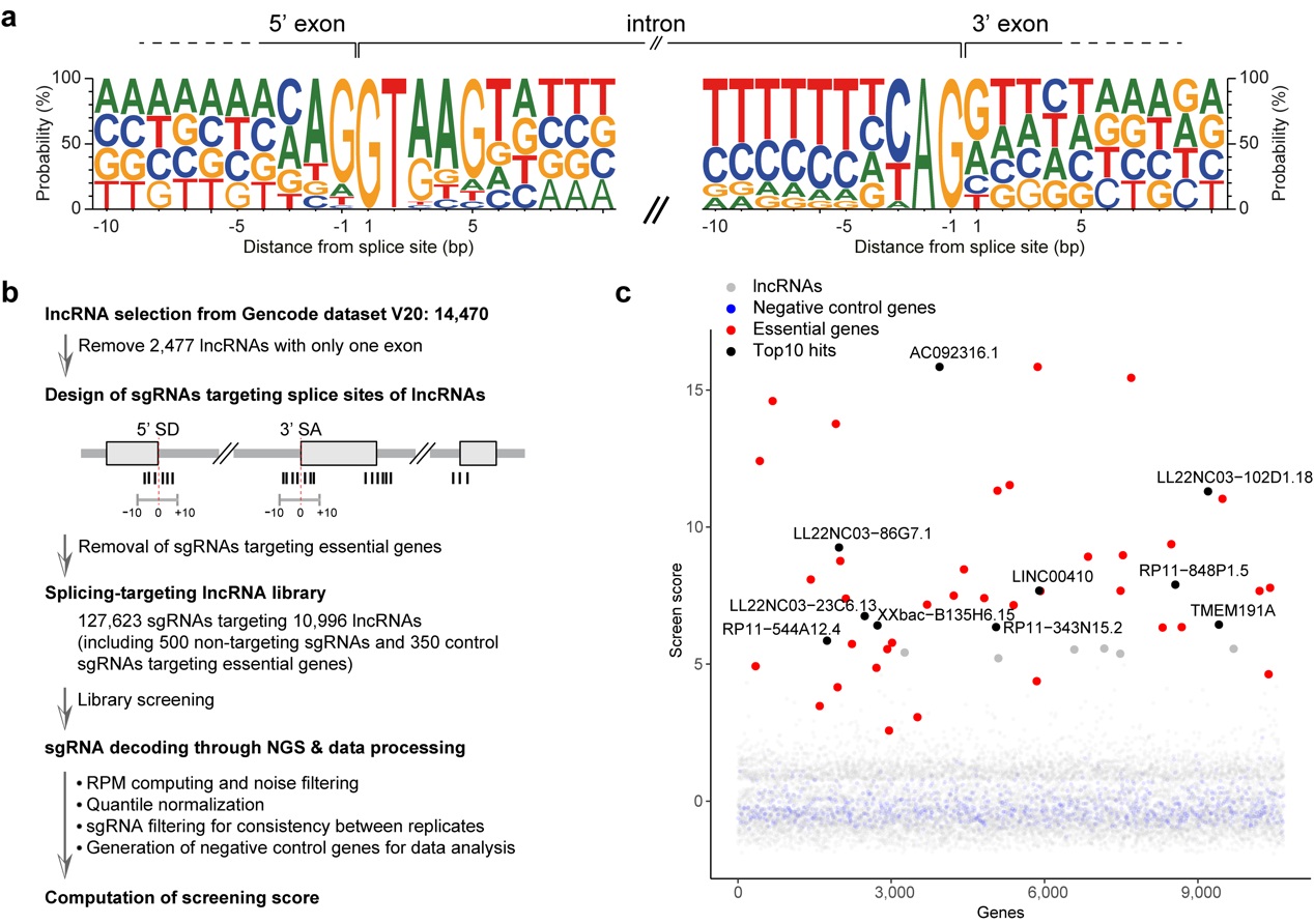 (a) 真核生物(人)剪接位点区域的基因组序列特征和碱基特异性。(b) 靶向剪接位点的长非编码RNA的功能性筛选策略。(c) K562细胞中影响细胞存活与增殖的lncRNA筛选结果。