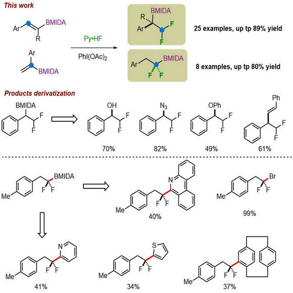该研究以易制备的苯乙烯基硼类化合物为原料,商业可得的HF?Pyr为氟化试剂,在高价碘(醋酸碘苯,PIDA)的作用下,通过芳基迁移一步构建α-和β-偕二氟烷基硼酸酯两类化合物;该转化条件温和(室温)、反应快速(1分钟)。两类产物在高效构建偕二氟烷基类化合物方面都有着独特优势,同时,该研究也为活性分子和相关药物快速引入偕二氟片段提供了新思路。