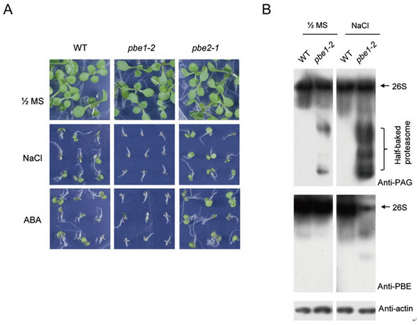 图: 盐胁迫导致拟南芥PBE1功能缺失突变体植物的发育停滞及蛋白酶体组装缺陷