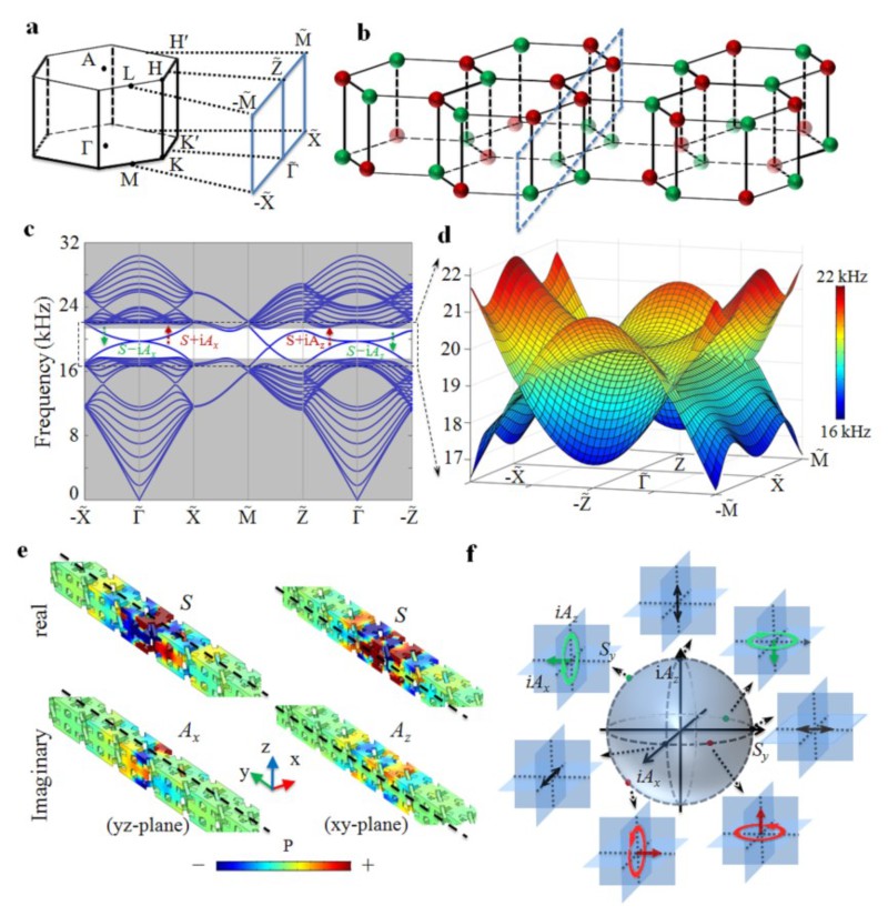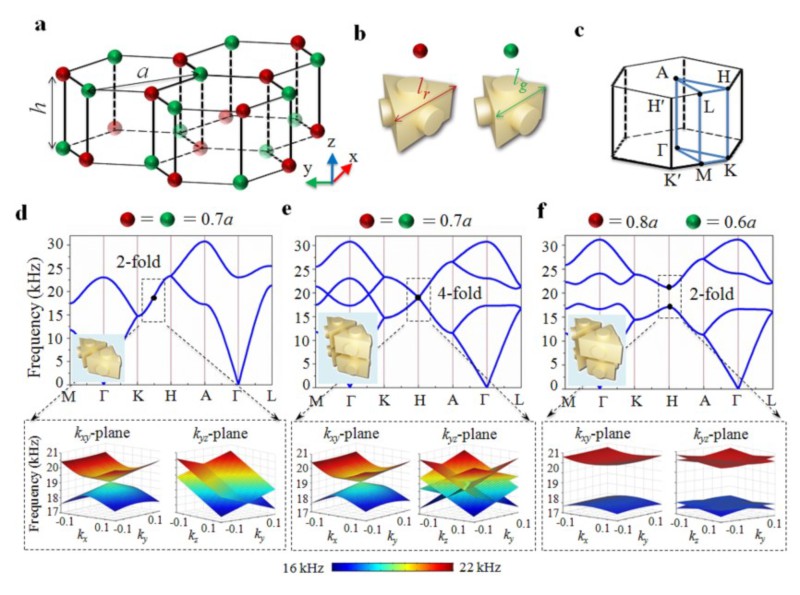 图1. a)双层六角晶格堆砌结构示意图;b)“声原子”由声学共振腔构成,近邻原子之间由管道连接;c)布里渊区示意图;d-f)体能带随频率的演化图。