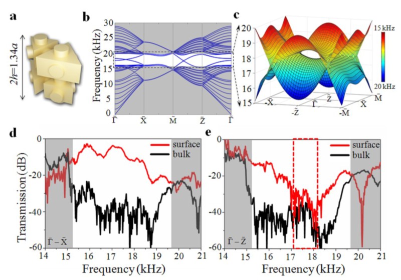 图4. a, 增加z向晶格常数情况;b,投影能带;c,具有开孔形状的表面态;d-e,沿x方向和z方向传播的声拓扑表面态透射谱,其中声表面态带隙处对应开孔大小。