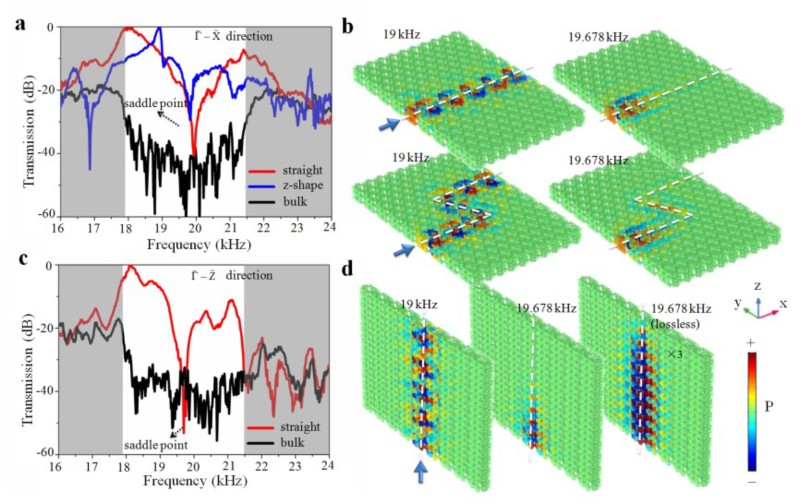 图3. a)沿x方向传播的声拓扑表面态透射谱;b)对应的声场分布;c)沿z方向传播的声拓扑表面态透射谱;d)对应的声场分布。鞍点处对应透射极小值。