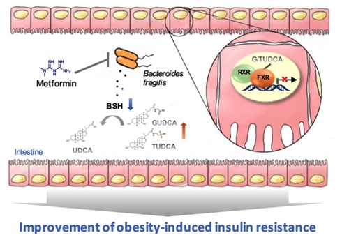 目前2型糖尿病已成为危害人类健康的重要疾病,二甲双胍是临床上治疗2型糖尿病的一线用药,其作用靶点并不明确。姜长涛课题组发现初诊2型糖尿病患者口服二甲双胍后,肠道菌群发生重塑,脆弱拟杆菌的丰度下降和结合型胆汁酸甘氨熊去氧胆酸GUDCA的含量升高。二甲双胍通过抑制脆弱拟杆菌产生的胆汁酸水解酶BSH活性,使GUDCA水平增加。进一步的机制研究揭示GUDCA是人法尼醇X受体FXR的内源性拮抗剂,具有潜在的治疗2型糖尿病的作用。二甲双胍通过肠道脆弱拟杆菌—胆汁酸GUDCA—肠FXR代谢轴发挥降糖作用。该研究解析了二甲双胍对于肠道菌群及其代谢产物的重塑作用;深入探究了肠道菌群作用于宿主的靶点及其功能;揭示了胆汁酸GUDCA与肠FXR作为治疗肥胖相关代谢性疾病的新靶点。