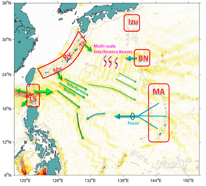 本研究给出了西太平洋菲律宾海半日内潮多源区干涉调制下的长距离能量辐射路径图,结合本研究团队前期给出的南海内潮长距离传递路径,不仅能够指导西太和南海针对内波强化观测站点的合理选定,也可辅助基于卫星高度计和现场观测资料准确提取多源内潮信号。该工作可对加深理解深海多尺度能量串级过程、改进海洋模式次网格参数化方案提供新思路。同时,因为菲律宾海涵盖第一岛链和第二岛链,是我国从近海走向大洋的关键海区,该海域内潮系统研究对于我国海洋环境保障也具有重要的应用价值。