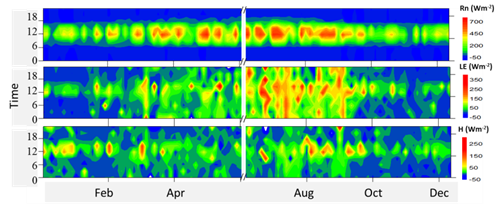 图2,鄱阳湖水体净辐射,潜热和显热通量的日变化及季节的相位突变过程