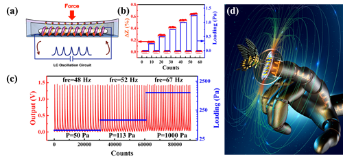 图3 (a)数字化柔性触觉传感器的原理图;(b)传感器分辨0.3Pa的微压力;(c)器件随压力改变的脉冲响应;(d)器件示意图